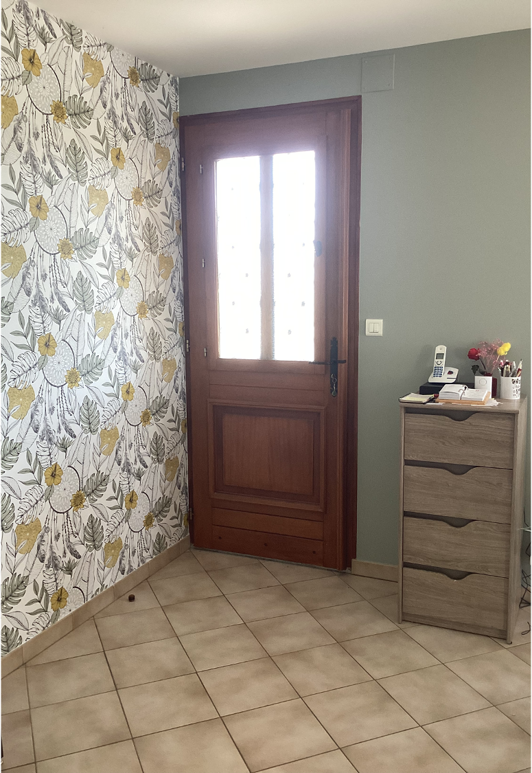 - Pour l’entrée, la pose de papier peint et de cette teinte douce « vert-de-gris » donnent un sentiment de sérénité dès l’arrivée dans la maison