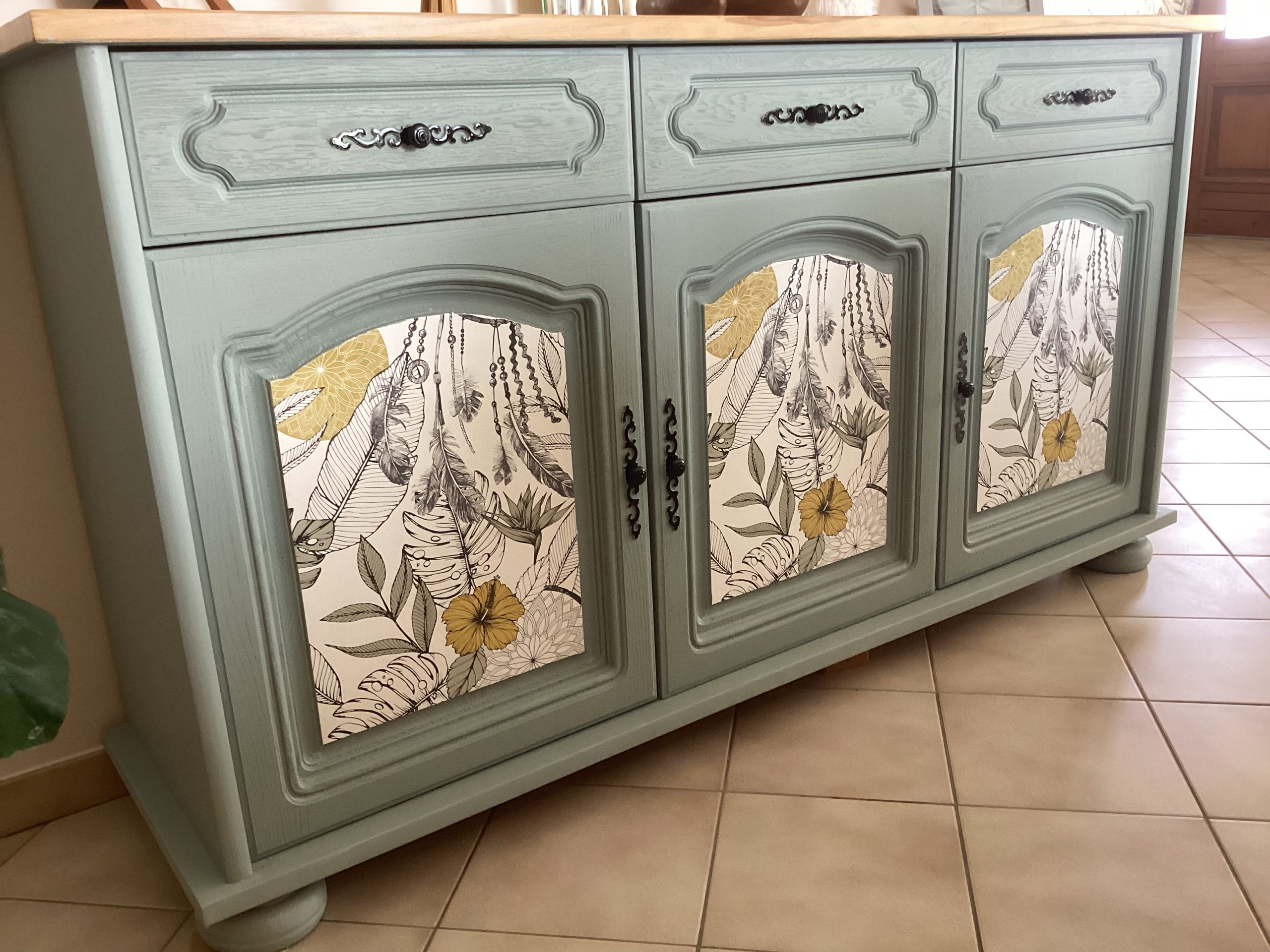 - Puis, les portes ont été recouvertes en partie de chutes de papier peint qui rappellent la végétalité de la pièce de vie