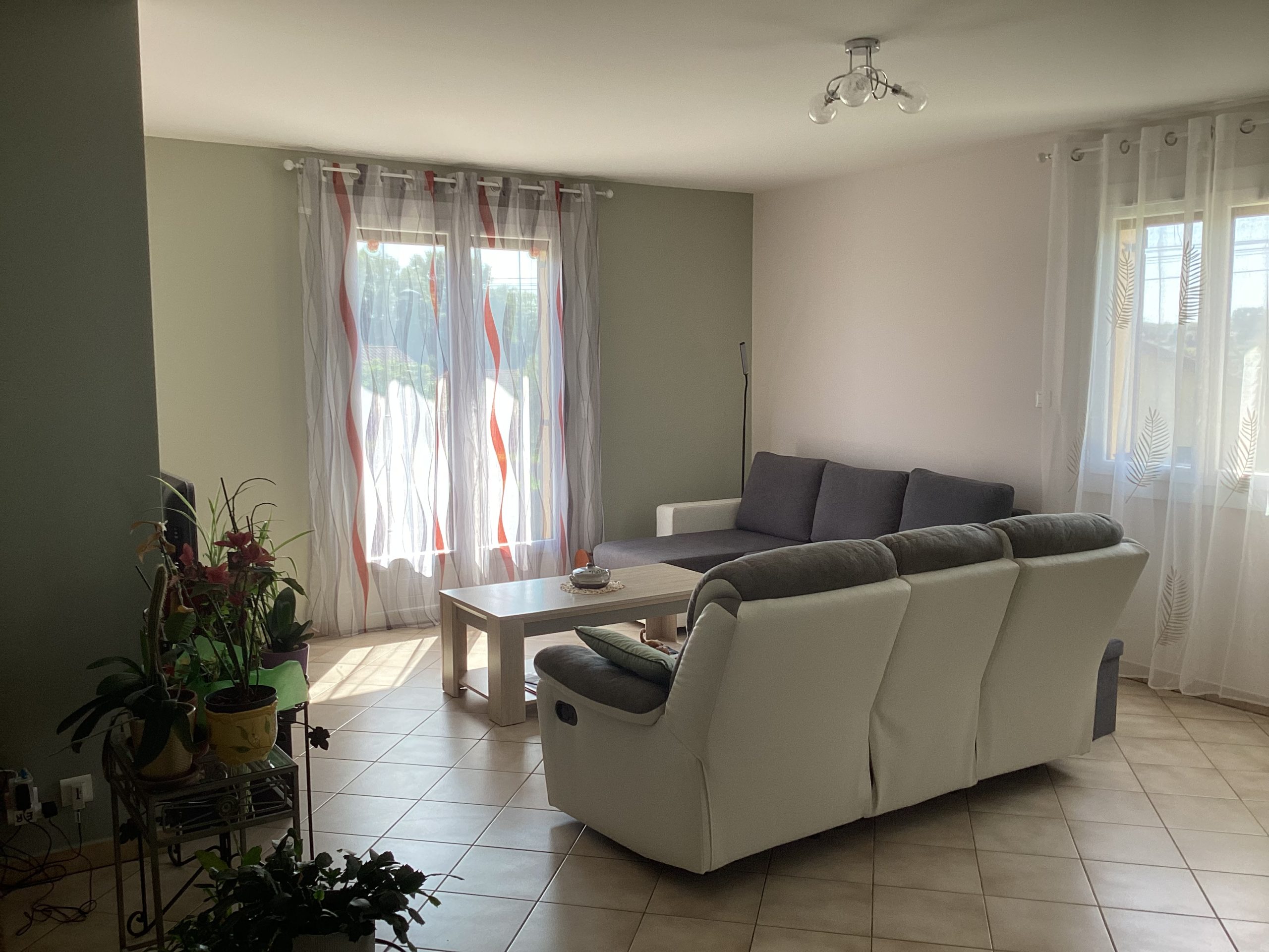 - Dans la pièce de vie, les murs qui s’opposent dans des teintes de « gris de lin » et de « vert-de gris » apportent la luminosité et la naturalité souhaitée par mes clients dans ce bel espace de vie complètement ouvert